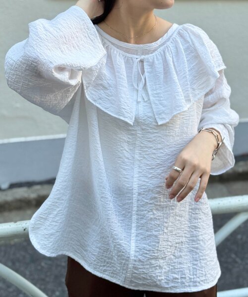 ■アイテム襟元のフリルがポイントの一枚で主役になるトップス。ゆったりとリラックスして着られるデザインが甘さを抑えてくれます。ポコポコと凹凸感のある生地にすることで、表情が出て華やかさをプラス。カラーは春らしいホワイト・イエローの2色展開。襟元のフリルは取り外し可能。フリルをジャケットに重ねたり、ブラウス一枚で着たりと別々で着るのもおすすめです。>>FRIPIERアイテム一覧※こちらは《FRIPIER》のタグがつきます。■素材・洗濯表示素材:レーヨン82% ナイロン18%洗濯表示:手洗い可※着用時・洗濯時は、必ず取扱い表示・タグをご確認の上、お取り扱い下さい。----------------------------------伸縮性:なし光沢:ややあり厚み:うすい透け感:あり裏地:なし----------------------------------《お取り扱い上のご注意》・タンブル乾燥不可《予約商品について》・サンプルの為、素材情報、洗濯表示については企画段階の情報を記載しております。公的機関での試験データ結果を受け、量産にあたり混率や洗濯方法の変更が発生する場合がございますので、ご了承くださいませ。・サンプルでの撮影、計測をしております。商品の仕様が一部変更になる場合がございます。・撮影サンプル品はブランドタグがついておりません。製品にはタグがつきますので、製品の表に縫い糸が見える場合がございます。・工場の生産の都合上、納期が変更になる場合がございます。検品や輸送の関係で、発送日が前後しますのでご了承ください。また、入荷状況により、お客様への発送が店頭販売より遅れる場合もございます。・店頭に陳列していた商品も含まれる場合がございます。《商品画像について》ご覧頂いている商品の写真につきましては、できるだけ実物の色に近くなるように努めておりますが お使いの環境(モニター、ブラウザ等)の違いにより、色の見え方が実物と若干異なる場合がございます。 予めご了承ください。《ハートをタップして商品のお気に入り登録》【ハートをタップ】登録カラーの商品の「残りわずか」「再入荷」「値下げ」通知を受け取ることができます。【各ショップアプリにてブランドフォロー】 新商品などの入荷情報、最新のニュースやお得な情報を受け取ることができます。