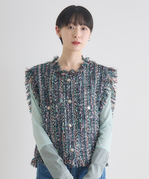 日常をクラスアップする上品ツイードジレ<POINT>多彩な糸が織りなす、表情豊かなファンシーツイード。エッジの効いた遊び心を添える、繊細なフリンジ使い。トレンドを意識したショート丈と、ゆとりを持たせた広めのアームホール。カジュアルからきれいめまで、圧倒的な着回し力。【デザイン・シルエット】首元、袖口、そして裾に施された切りっぱなしのフリンジデザインが、「抜け感」と「こなれ感」をプラス。フロント部分と両胸のポケットに配された、輝きを放つシルバーボタンがデザインのアクセント。厚手のニットやボリューム袖のブラウスの上からもストレスなく羽織れます。ショート丈のデザインで、重心を高く見せることでスタイルアップも叶えます。【素材感】異なる質感や色の糸を複雑に織り交ぜた、立体感溢れるファンシーツイード素材。単色では決して表現できない、奥行きのある色彩と豊かな凹凸感が、圧倒的な存在感を放ちます。【カラー】ブラック アイボリー 2色展開【スタイリング】シンプルなボウタイブラウスに重ねて、シルバーボタンを際立たせた上品でハンサムな通勤スタイル。いつものデニムに合わせるだけで甘辛MIXが完成。シンプルなのに最高にかっこいい、大人の上級カジュアル。裏地:あり光沢:なし伸縮性:なし透け感:なし生地の厚さ:普通ポケット:あり【TRANOI.】Fukuoka japan / Women’s wear brand.虎の衣(威)を狩る狐 トラノイ。ありそうでなかった衣で毎日新しい自分に!※照明の都合上、多少の色ブレが生じてしまう可能性がございますので、予めご了承くださいますようお願い致します。---------------------------------------------------●お気に入り登録でお得情報を手に入れよう!「商品のお気に入り登録」をすると、再入荷通知や、ラスト1点の通知、セールの通知など、お得情報が届きます。また、マイページでいつでも確認が可能になります。「ブランドのお気に入り登録」をすると、新商品や再入荷、などいち早くブランドの最新情報をお届けします。ぜひ、ご利用ください。----------------------------------------------------