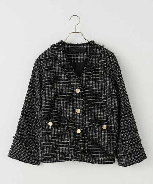 JOURNAL STANDARDクラシカルなツイード素材に、切りっぱなしのフリンジディテールで抜け感をプラスしたノーカラージャケット。 フロントとポケットにあしらわれたゴールドボタンが上品なアクセントに。首元はスッキリとしたVネックデザイン。タートルネックやボウタイブラウスなど、インナー次第で表情の変化を楽しめるのが魅力です。 オフィスシーンからデニムを合わせた大人のカジュアルダウンまで、オンオフ問わず活躍する主役級の1着です。これからの季節にオケージョンシーンにも着用いただけます。※※ナチュラルについて*日光や蛍光灯の光に弱く、色あせ(変色)しやすい性質があるので、長時間の直射日光は避けてください。 *この製品は素材の特性上、過度な力が加わると縫目が開いたり、目寄れ(織組織の片寄り)を生じる恐れがあります。 *素材の特性上、表面にざらつきのあるものとの擦れや引っ掛けにご注意ください。 *素材の特性上、洗濯や着用中の摩擦により生地表面が毛羽立ち、毛玉(ピリング)が生じます。 連日の着用は避け、毛玉が生じた場合は引っ張らず、小バサミで丁寧にカットしてください。 ※取り扱いについては、商品についている品質表示でご確認ください。※照明の関係により、実際よりも色味が違って見える場合があります。またパソコン・スマートフォンなどの環境により、若干製品と画像のカラーが異なる場合もございます。※商品の色味は、商品アップ画像をご参照ください。本体:ドライクリーニング
