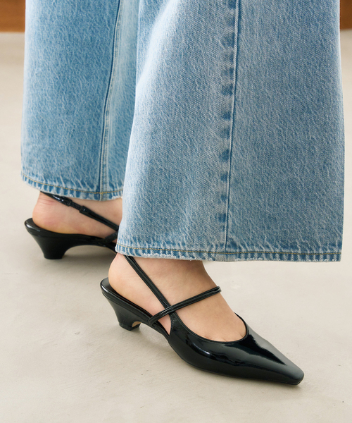 ツヤのある素材感とほどよい抜け感が春にぴったりなスリングバックシューズ。甲ストラップの内側には一部ゴムを使用し、ワンタッチで着用できるのも嬉しいポイント。キレイめな印象ながら安定感のあるハーフウェッジヒールで、モードなスタイリングにもハマりオンオフ問わず活躍します。ソックスをレイヤードしてカジュアルなスタイリングに合わせるのもおすすめです。**********************【スタッフ着用コメント】《スタッフH》普段サイズ:23.5/着用サイズ:23.5サイズ感: 素足で着用して、普段のサイズでジャスト。履き心地:パッと見細身ですが、履いてみると締め付けなく足幅広めですが快適に履けました。ワンタッチで履けるので忙しい朝にもぴったり。甲の高い位置に1本ストラップがあるので、安定感抜群で歩きやすかったです。***********************カラーにより素材が異なります。 ブラックB・ナチュラル・グリーンC 甲材:人工皮革メタリック 甲材:合成皮革*サイズによりヒールの高さが多少前後することが御座います。予めご了承ください。*照明の関係により、実際よりも色味が違って見える場合があります。またパソコン・スマートフォンなどの環境により、若干製品と画像のカラーが異なる場合もございます。*商品の色味は、商品アップ画像をご参照ください。