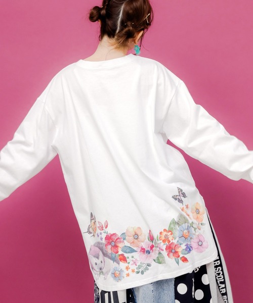 + ScoLar 商品 + 胸元のウサギ柄プリントがカワイイ♡ くるっと後ろを向くと、裾にもお花やハリネズミ・蝶々のプリントがたっぷり! アウターを羽織ったときに裾の柄が見えるように ちょっぴり丈が長めになっているのがこだわりポイントなんです◎ お手持ちのトップスアイテムとレイヤードして、 いろんなスタイリングをお楽しみください♪ ●model:Hana. 160㎝/63inch ●model着用:01(オフホワイト) (着用商品はサンプルの為、実際のデザインと変更がある場合がございます) ーーーーー 裏地:なし 透け感:やや透け感あり 生地の厚さ:普通 生地感:やわらかめ 伸縮性:ややあり ポケット:なし ーーーーー 取り扱いのご注意: ※この製品は摩擦や水濡れにより色落ちにすることがありますのでご注意ください。 ※この製品は生地独特な風合いを出すために、製品加工してあります。(製品は1点、1点多少表情が違います) ※この商品は糸及び編組織の性質上、引っ掛け・引っ掛かりやすい為、着脱時や取り扱いにご注意下さい。