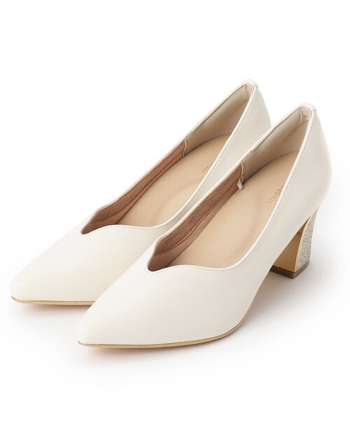 【デザイン】足をきれいに見せつつ歩きやすい、働く女性のためのベーシックパンプス。深すぎないVカットの履き口で足元をすっきり見せる美しいシルエット。ポインテッドトゥで上品な印象に仕上げています。ヒールはキラキラのアクセント入りでさりげなく華やかさをプラス。ブラック・アイボリーの定番2色で幅広いコーデに合わせやすいデザインです。甲素材は合皮、底材は合成底を採用し、見た目はきちんと感を保ちながら扱いやすさも両立。オンタイムにもデイリーにも活躍する頼れるベーシックパンプスです。【機能性】軽量立体クッションインソールで負担を軽減。凹凸型クッションが土踏まずをしっかりサポートし、長時間の歩行でも疲れにくい設計です。履き口のカットで締め付け感を和らげ、幅広さんでも安心して履けるフィット感を実現。踵パッドの柔らかいクッションがかかとを優しくホールドし、安定感をサポート。静音リフト採用で歩行時のコツコツ音を軽減、オフィスや移動シーンでも快適に使えます。※照明の関係により、実際よりも色味が違って見える場合があります。また、パソコン・スマートフォンなどの環境により、若干製品と画像のカラーが異なる場合もございます。----------------------------------------★お気に入り登録がおすすめ★▽気になる商品はハートマークをクリック!・再入荷やセールの通知をお知らせ・お気に入り一覧からいつでもチェック▽ブランドのお気に入り登録も!・新商品やお得な情報をいち早くお知らせ----------------------------------------店舗へのお問い合わせ商品番号:P93-75500●製品寸法:38(23.0cm~23.5cm):ヒール高6.5cm 幅8cm つま先6.5cm40(24.0cm-24.5cm):ヒール高6.5cm 幅8.5cm つま先6.5cm備考:重量:38(M)片足約230g