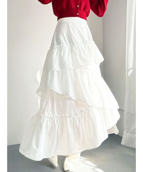 ボリューム感のあるフェミニンなフレアスカート ▽デザイン▽ ランダムなフリルデザインで動きのあるシルエットに仕上げました。 薄手の生地を使用し、軽やかさと柔らかな女性らしさを演出。 春にぴったりのさわやかな印象のスカートです。 ▽カラー▽ 白、アイボリー、黒の3色展開。 白は無地、黒とアイボリーは小花柄です。 ▽スタイリング▽ カーディガンやニットトップスを合わせたフェミニンなスタイリングはもちろん、Tシャツを合わせたカジュアルなスタイリングもおすすめ◎ デイリー使いだけでなく、デートや女子会にもピッタリのアイテムです♪