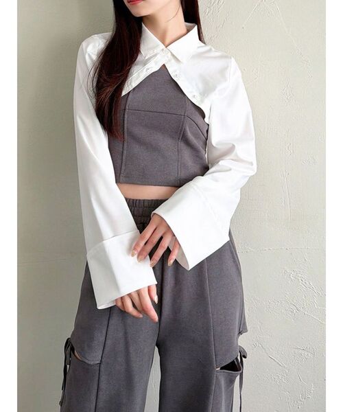 シャツとカットのドッキングトップス ▽デザイン▽ ベアトップとシャツをレイヤードしているデザインのトップス。 シャツはカジュアルすぎず透け感のある素材を使用し涼し気に着ていただけます。 ベアトップはカット素材で着心地よく、ボディラインにフィットするサイズ感で 上半身をコンパクトに華奢見せしてくれます。 ▽カラー▽ 黒・グレー・チャコールグレーの3色展開。 ▽スタイリング▽ 同色のスウェットパンツを合わせればセットアップとしての着用が可能◎ デザイン性のあるトップスなのでお持ちのボトムス合わせでもサマになります。 かっちりし過ぎず程よく抜け感のあるアイテムです。 【セットアップアイテムはコチラ】 >>サイドリボンスウェットパンツ
