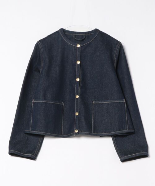 ブランドを代表するノーカラーキルティングジャケット、ARKLEY A-LINE(アークリー Aライン)のシルエットはそのままに、デニム素材を使用したアークリー Aライン デニム。肩のラインが少しドロップしたゆったりシルエットのアークリー Aライン デニムは、羽織るだけでサマになり、抜け感のあるコーディネートが叶います。こちらのワンウォッシュデニム素材は、程よいハリが特長で、立体的な美しいシルエットが際立ちます。生地の状態でワンウォッシュしてから縫製しているので、あたりが少なくクリーンな印象に。ゴールドに輝くドットボタンがきりりと全体の印象を引き締めます。