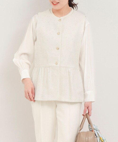 ◇26SS◇MICO COULIER重ねるだけで、上品レイヤードが完成。いまどきセレモニースタイルも叶うツィードジレ◆Point・ラメ糸を織り込んだ春らしい表情が魅力のランダムラメツィード素材・ウエストラインに自然なメリハリをつくるペプラムデザイン・女性らしく上品なシルエットを演出・艶感ボタンがアクセントになり、きちんと感と華やかさを両立・デイリーにはもちろん、セレモニーや特別なシーンにも対応・ブラウスやワンピースに重ねるだけで旬なスタイルが完成・普段使いからお出かけまで、春らしい華やかさをプラスする主役アイテム----------------------------------------------------------透け感:なし裏地:切替え部分上身頃のみあり伸縮性:なし光沢感:なし洗濯:ドライクリーニング----------------------------------------------------------気になる商品は、お気に入り登録(ハートマークをタップ!)がオススメですクーポン情報や入荷情報など、お得な通知が受け取れるようになります----------------------------------------------------------●お取扱い上のご注意●末永くご愛用頂くために、アテンションタグを必ずご確認の上、着用又はお取り扱い下さい。※店頭及び屋外での撮影画像は、光の当たり具合で色味が違って見える場合があります。商品の色味は、スタジオ撮影の画像をご参照下さい。※商品画像に関しては出来る限り忠実に表示出来るよう努めておりますが、お客様がご利用のモニターの設定及び特性により、実際の商品と比較し色味に若干の誤差が生じる場合があります。※製品洗い加工の商品は、多少の歪み、シワなどが見られたり、風合いやサイズ等が1枚1枚異なります。汗や雨等で濡れた時や、摩擦により色落ちし、他の衣料を汚すことがありますので(特に濃色のもの)ご注意ください。<MICO COULIER>今の気分をノーリーズらしく取り入れたデイリーアイテムを提案します。ウエアからグッズまで幅広いラインアップ。やわらかく透明感のある着こなしで新しい自分を発見。MICO COULIERの商品につきましてはアウトレット店舗にて展開をしております。