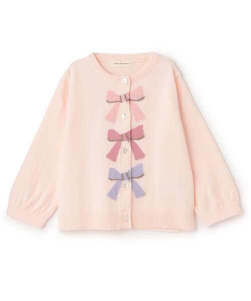 フロントに並べた女の子らしいリボンモチーフが目を引くカーディガンです。上品なワンポイントデザインでどんなボトムとも相性が良く、デイリー使いにおすすめ。一枚での着用はもちろん、肌寒いときの羽織りとしても活躍します。内側にお名前を記入できるタグつき。【透け感】透けない【生地の厚さ】普通【伸縮性】あり【裏地】なし【ポケット】なし【アジャスター】なし