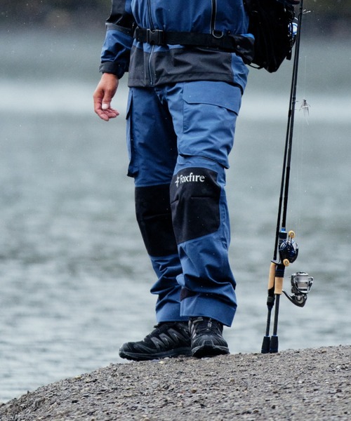 防水性、防風性、透湿性に優れた次世代GORE-TEXファブリクス3レイヤーを採用。フロントファスナー内側に防水マチを設け、着座時に水圧のかかる尻部の縫い目を無くすことにより、雨天時のボートフィッシングで最大の悩みだった股部からの浸水をシャットアウトします。負担のかかるヒザ、尻部はナイロンの7倍の耐久性を備えたコーデュラファブリックで補強。立体裁断パターンにより、しゃがむ、座るといった動作にもスムーズに追従します。雨天時のレインジャケット着用を想定し、腰から上は動きやすさや通気性を考慮したナイロンオックス素材を採用。脇下ポケットの袋布はメッシュ仕様で、ベンチレーション機能も兼備しています。両サイドにルアーケースやB5サイズのタブレット端末も入る大型のカーゴポケットを装備。