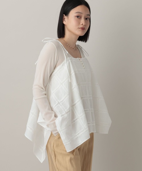 ーーー刺繍のデザインを全体にたっぷり入った贅沢感のあるキャミソールポンチョとしても着ていただけます。ーーー【デザインと特徴】着用時にきれいなフレアシルエットが楽しめるキャミソール。刺繍を全体に使うことで高級感あるアイテムです。肩ひもの長さを短く5・6cmくらいの位置で結ぶと、オフショル型のポンチョのようなトップスに変身します着用2WAYで楽しんでいただけるので気分によっても変えて楽しめます。【素材特徴】正方形の平織生地をつなぎながらつぎはぎをしていったような、刺繍のデザインがうつくしい素材を使用しています。綿タッチで軽くやわらかい肌触りです。【スタイリング】同系色のインナーを合わせたワントーンコーデも可愛いです。【洗濯可否】手洗いでのお手入れが可能です。