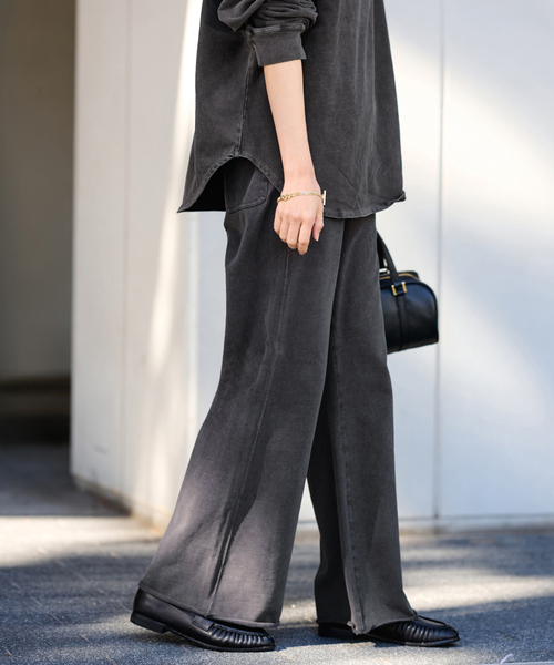 ◆大人気!加工感が魅力のパンツが新色を携えて再入荷!・旧品番25030220776040の追加品番です。・同一商品でも個体差が生じるため、採寸内容に若干の差が生じる場合がございます。ヴィンテージライクな風合いが魅力のパンツ。表起毛の天竺素材に製品染めとウェットオゾン加工を施し、USED感のあるこなれた表情に仕上げました。程よい肉感とコットンの柔らかさが、季節の変わり目にも心地よくフィット。ややフレアがかったラインで、コーデをすっきりと見せてくれる効果も期待できます。同素材のトップス(26070220799010)と合わせた、セットアップスタイルもおすすめ。**********************透け感:なし裏地:なし伸縮性:あり光沢感:なし生地の厚さ:普通**********************※シリーズのご案内ウェットオゾン加工L/Tee(26070220799010)ウェットオゾン加工スカート(26060220764010)※加工による色あい、風合い、サイズの違いがあります。また色落ちや色移りの恐れがあります。※ウェットオゾンというブリーチの様な加工を施してユーズド感を表現しています。染色の性質上、色味や風合いに個体差が生じます。※取り扱いについては、商品についている品質表示でご確認ください。※こちらの商品は、FRAMeWORK での取り扱いになります。直接店舗へお問い合わせの際は FRAMeWORK 店舗へお願い致します。※照明の関係により、実際よりも色味が違って見える場合があります。またパソコン・スマートフォンなどの環境により、若干製品と画像のカラーが異なる場合もございます。予めご了承の上ご注文ください。※商品の色味は、商品アップ画像をご参照ください。本体:洗濯機洗い(弱)