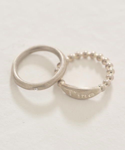 異なるデザインで、そのままでももちろん、 重ね付けなどスタイリングに合わせた楽しみ方が叶う、リングセット。 ホワイトシルバー調で清潔感があり、手元が華やかに仕上がります。 point ・リング①ひと粒ずつ丁寧に並べたビーズ状のフォルムに、正面部分にはTINA刻印が入ったプレートデザイン ・リング②リング幅は約3mmと細身でありながら、中心にラインストーンを1個のみ付け、程よい存在感も◎上品に光を受け、控えめながらも手元を美しく演出します <お届け時のシワにつきまして> ページで着用している商品は撮影前に全てプレスをかけております。(バッグ・小物等除く) その為お送りする商品は畳みジワや細かいシワがついている場合がございます。 <色移り・色落ちについてのご注意点> この商品は摩擦(特に湿った状態での摩擦)や汗や雨などでぬれた時は他の衣料や下着に色が移る事がありますので、十分ご注意ください。 <臭いについてのご注意点> 染料や加工を加えた際の臭いが製品に付着している場合がございます。 臭いが気になる場合には、風通しの良い日陰の場所で陰干しをしてください。 <写真・画像・カラーについて> 商品のカラーは撮影環境・視認性を考慮した色調整を行っておりますが、撮影条件やブラウザ、パソコンの環境により、実物と異なる事がございます。また、モデル画像・スナップ画像は撮影条件の影響を大きく受けやすくなっております。商品単体の画像をご参考にしていただくようお願いいたします。 <製品のお取り扱いについて> 取り扱いについては、商品についている品質表示に詳細を記載しております。必ずご確認ください。 <洗濯について> お洗濯は商品についている洗濯絵表示に従って行ってください。 ・本商品は製品の特性上、返品は致しかねますので予めご了承ください。