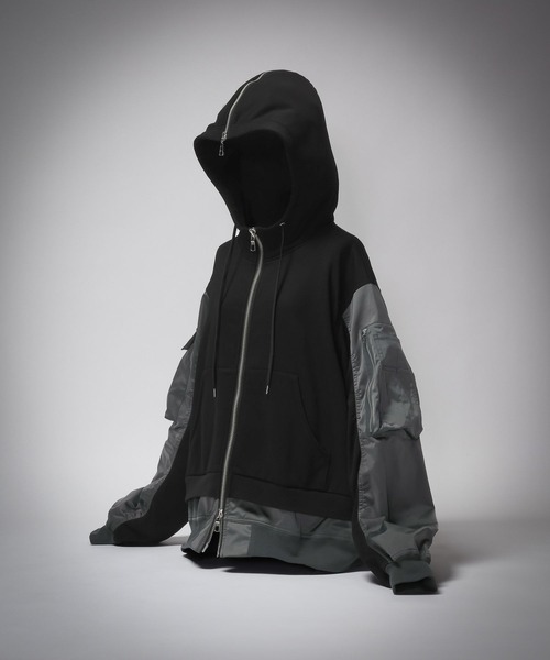 ーーースウェットとMA-1を融合させた、ドッキングデザインが目を惹くジップパーカー。ーーーDESIGNスウェット生地と、光沢感のあるポリエステル生地を組み合わせた異素材ドッキングデザイン。素材ごとの質感のコントラストが、奥行きのある表情を生み出します。ボディと袖、そして裾周りで大胆に施された配色切り替えがポイント。一枚羽織るだけで、ストリートモードなエッセンスをスタイリングにプラス。MA-1特有のボリュームスリーブやポケットデザインにより、立体感のあるフォルムを演出。身体を包み込むような、独特のシルエットを楽しめます。フロントには上下どちらからでも開閉可能なダブルジップを採用。裾側を開けてインナーを見せるなど、着こなしに合わせたシルエット調整が可能です。MATERIAL本体には綿をベースにした素材を使用。スウェット特有の柔らかさと肌触りの良さを活かしつつ、ポリエステルを混紡することで型崩れしにくい安定感を持たせています。切り替え部分には、滑らかで光沢のあるポリエステル生地を使用。MA-1らしいミリタリーな質感を取り入れられます。袖口や裾のリブで、適度な伸縮性とフィット感を確保しています。