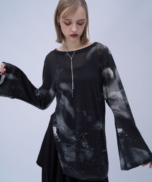ーーー サイドスリットとグラフィックデザインがモードなセミシアートップス ーーー point □アートなグラフィックデザインがモードな一枚 □サイドスリットとフレアスリーブになっており、女性らしいニュアンスをプラス □身体のラインを拾いすぎないシルエットで着心地〇 □コットン混の微透け素材で伸縮性がある □ボートネックの為、鎖骨ラインが綺麗に見せる styling 骨格ナチュラル:ワイドパンツやロングスカートを合わせてAラインを意識したスタイルが似合います。スリットが入っているためそのまま着てもラフすぎずにモード感を出して着ていただけます。 骨格ウェーブ:フレアやAラインのスカートを合わせると女性らしい印象に。華奢なネックレスをして鎖骨ラインを強調すると顔回りも華やかな印象を出せます。 骨格ストレート:スラックスやデニムなど直線のイメージを足して引きしてると◎ビスチェやベルトでウエストマークして腰の位置を高めに見せると全体のバランスにまとまりが出ます。 ※加工を施した画像を使用しております。 実物と色味が異なる可能性があるため、色味は詳細後ろにある生地寄り画像を参考にお願いいたします。 あらかじめご了承下さい。