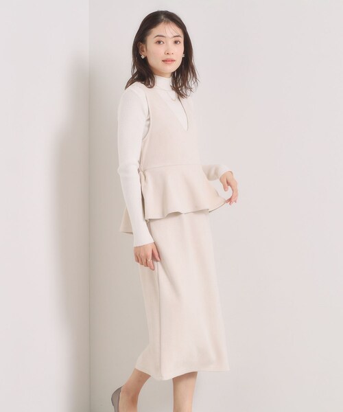 【デザイン】ペプラムデザインが品よく華やか。レイヤード風でこなれ感アップ。レイヤード風デザインの大人なきれいめジャンスカ。程よい広がりのペプラムデザインが甘すぎず上品な印象に。スカート部分はIラインのシルエットですっきり着こなせます。深めのVネックが胸元をすっきりと見せてくれるので、アクセサリーも映えるデザイン。【素材】フェイクスエード調のジャージー素材です。もっちりとした弾力とパウダリーな表面感が特徴。【仕様】・ポケットなし・ウエスト後ろゴム・裏地なし※こちらの商品はやや透け感があるため、インナーの着用をおすすめします。※照明の関係により、実際よりも色味が違って見える場合があります。また、パソコン・スマートフォンなどの環境により、若干製品と画像のカラーが異なる場合もございます。----------------------------------------★お気に入り登録がおすすめ★▽気になる商品はハートマークをクリック!・再入荷やセールの通知をお知らせ・お気に入り一覧からいつでもチェック▽ブランドのお気に入り登録も!・新商品やお得な情報をいち早くお知らせ----------------------------------------モデル情報:身長164cm B80 W60 H84 着用サイズ:00(フリーサイズ)店舗へのお問い合わせ商品番号:P93-55002●製品寸法:00(フリーサイズ):総丈110cm B78cm 肩幅36cm W72~78cm H90cm備考: