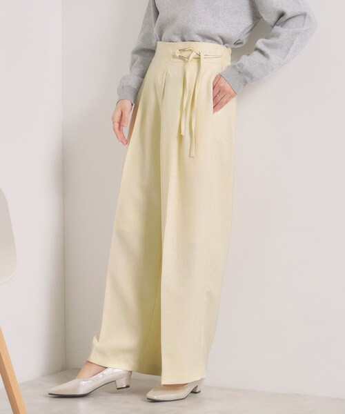 【デザイン】 存在感のあるゴールドバックルがアクセントのワイドパンツ。 ウール調のツイル素材で今すぐ着られる素材感。 曲線的なラインでトレンド感ある金具がポイントのワイドパンツ。 アシンメトリーなデザインがおしゃれ感を演出できるデザイン。 素材はウール調のツイル素材で春らしさもありつつ、今すぐ着られる寒々しくない素材感です。 後ろウエストはゴム仕様。 着用する際は、金具の紐をほどいてから着用してください。 【素材】 ウールライクなポリエステル混ツイル素材。 【仕様】 ・ポケット数:横×2 ・ウエスト後ろゴム ・裏地あり ※こちらの商品はやや透け感があります。 ※照明の関係により、実際よりも色味が違って見える場合があります。また、パソコン・スマートフォンなどの環境により、若干製品と画像のカラーが異なる場合もございます。 ---------------------------------------- ★お気に入り登録がおすすめ★ ▽気になる商品はハートマークをクリック! ・再入荷やセールの通知をお知らせ ・お気に入り一覧からいつでもチェック ▽ブランドのお気に入り登録も! ・新商品やお得な情報をいち早くお知らせ ---------------------------------------- モデル情報:身長164cm B80 W60 H84 着用サイズ:00(フリーサイズ) 店舗へのお問い合わせ商品番号:P93-65004 ●製品寸法: 00(フリーサイズ):W64~68cm H88cm 股下67cm 前股上35cm 渡り幅35cm 裾幅29cm 備考: