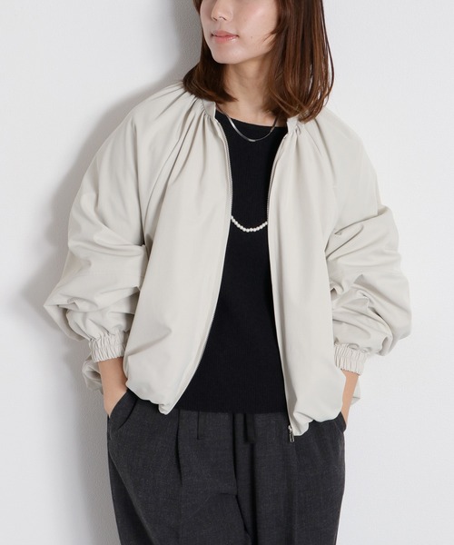ふんわりバルーンシルエットが大人可愛いジップブルゾン♪◇Point◇ネックから裾にかけてギャザーをふんだんに入れた、バルーンシルエットのジップブルゾン。裾部分にはゴムを入れ、メリハリをつけることで女性らしい丸みのあるシルエットに。前後で着丈の長さを変えており、バックはヒップが半分ほど隠れる長さです。フロントはショート丈になっているのでバギーデニムやナロースカートなど、様々なボトムとのバランスを取りやすくしています。肩はラグランスリーブにしており、アクティブな印象を与えるとともにキレイな落ち感が出るよう仕立てています。袖もボリュームスリーブなので気になる二の腕部分をカバー。袖先のリブが溜まり具合を可愛く表現します♪表面はやや薄手の素材ですがハリと光沢を出すことで上品見えする1着に。裏地が付いているので春から秋にかけてライトアウターとして活躍するジップブルゾンです。◇Material◇やや光沢のあるポリエステル素材を使用し、軽さを出しています。さらさらっとした滑らかな肌触り。シワになりにくいイージーケア素材なのでバッグインしておくのにも便利な1着です。マットな質感の中でフロントのシルバージップがモード感を引き立てます。※ご家庭でのお洗濯が可能です。※裏地あり※サイドポケット付き◇Coordinate◇ハイネックインナー+キレイめスラックスやワンピースで合わせてモードに振りきったスタイルもおすすめですが、カジュアルロゴT+デニムで大人のストリートカジュアルも素敵です♪ショート丈なのでインナーをタックインするとスタイルアップが期待できます。ややオーバーなサイズ感なので、タイトなボトムと合わせるとさらに上品見えします。※照明や天候により実際の色味と異なって見える場合がございます。ご了承くださいませ。【キーワード】#Y2K#10代#20代#30代#40代#50代#羽織#春コーデ#秋コーデ#ドルマン#モノトーン#スタンドカラー#ノーカラー