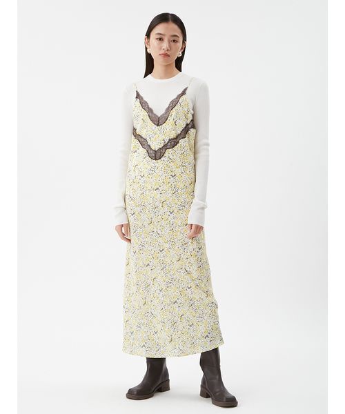 【ウォッシャブル】【レイヤード万能のキャミワンピ。アートのようなヴィンテージ調のプリントと、繊細なレースで鮮度アップ】【Design/STyling】鮮やかな色合いと、ニュアンスのあるプリントが印象的な、スリップ風のキャミワンピースです。軽やかで程よいシアー感のある素材を使用することで、レイヤード映えするシーズンレスなアイテムに仕上がりました。胸元に配色レースを入れることで、引き締め効果とこなれた雰囲気を演出。また、2段目のレースから下には裏地が付いているので、安心感もアップ。スッキリしたセミフレアなシルエットで、裾が広がりすぎないのも大人っぽくて◎。肩紐はアジャスターで調整できるので、着回し力もアップ。下にTシャツやニットなどを重ねてワンピースのように見せたり、カーデやプルオーバーを上から着てスカート見えのように着たりと、さまざまなレイヤードを楽しめる一枚です。【Fabric】上品なシアー感のある素材と繊細なレースが、ヴィンテージアイテムのようなムードを演出しています。カラーは3色をご用意。アートな雰囲気の抽象的なプリントが新鮮な<YEL>と<BRW>、水彩画タッチのドレッシーな<BLU>で展開しています。※照明の関係により、実際よりも色味が違って見える場合があります。またパソコン・スマートフォンなどの環境により、若干製品と画像のカラーが異なる場合もございます。予めご了承ください。商品の色味は、商品単品画像をご参照下さい。 ※商品画像はサンプルのため、色味やサイズ等の仕様に変更がある場合がございますので、予めご了承ください。