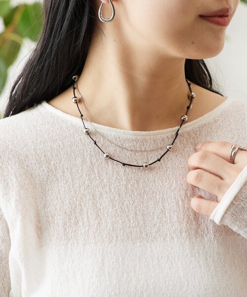 ■アイテムブラックコードにシルバーモチーフを配した、程よく存在感のあるステーションネックレス。細身のシルバーチェーンが繊細さをプラスしてくれます。モチーフを動かして位置やバランスをお好みで調整できるのもポイントです。カジュアルなコーデにさらっと合わせられるアイテムです。■素材真鍮シルバーメッキ紐:ナイロン※着用時は、必ず取扱い表示・タグをご確認の上、お取り扱い下さい。《予約商品について》・サンプルの為、素材情報については企画段階の情報を記載しております。公的機関での試験データ結果を受け、量産にあたり混率の変更が発生する場合がございますので、ご了承くださいませ。・サンプルでの撮影、計測をしております。商品の仕様が一部変更になる場合がございます。・撮影サンプル品はブランドタグがついておりません。製品にはタグがつきますので、製品の表に縫い糸が見える場合がございます。・工場の生産の都合上、納期が変更になる場合がございます。検品や輸送の関係で、発送日が前後しますのでご了承ください。また、入荷状況により、お客様への発送が店頭販売より遅れる場合もございます。・店頭に陳列していた商品も含まれる場合がございます。《商品画像について》ご覧頂いている商品の写真につきましては、できるだけ実物の色に近くなるように努めておりますが お使いの環境(モニター、ブラウザ等)の違いにより、色の見え方が実物と若干異なる場合がございます。 予めご了承ください。《ハートをタップして商品のお気に入り登録》【ハートをタップ】登録カラーの商品の「残りわずか」「再入荷」「値下げ」通知を受け取ることができます。【各ショップアプリにてブランドフォロー】新商品などの入荷情報、最新のニュースやお得な情報を受け取ることができます。