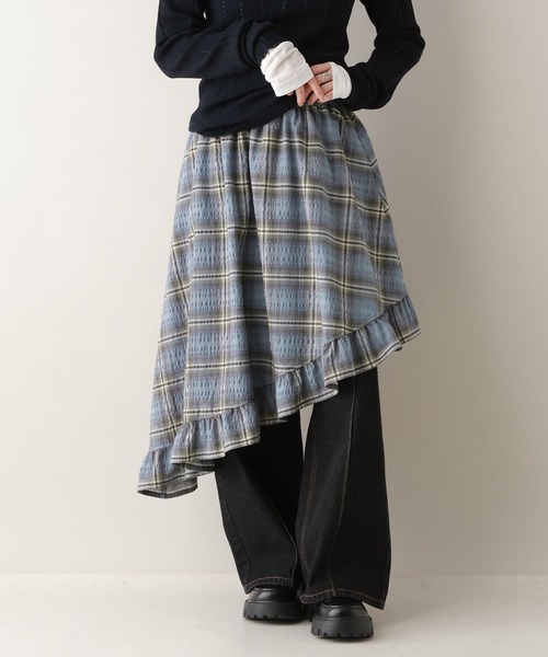 レイヤードスタイルにぴったりなトレンドスカート◎■おすすめの着こなし☆レイヤードスタイルには・・・スラックスやデニムと合わせる、レイヤードスタイルが◎トップスはベーシックなスウェットやロンTを合わせることで、程よくラフな着こなしに。☆一枚で穿くなら・・・シンプルなニット×ローファーと合わせる、きれいめスタイルが◎アクセサリーや小物で、アクセントを効かせればこなれ感もUPします。ーーー■ポイントチェック柄が目を惹く、アシメデザインスカート。表面感のある素材を使用しているので、スタイリングのアクセントになります。程よい丈感なので、レイヤードスタイルにぴったりなアイテムです。ウエストはぐるりと一周ゴム仕様×紐付きなので、ノンストレスな穿き心地に◎一枚でもレイヤードスタイルでも映えるスカートです。■素材柔らかく、肌触りの良い混紡素材を使用。素肌に着用しても心地よいアイテムです。