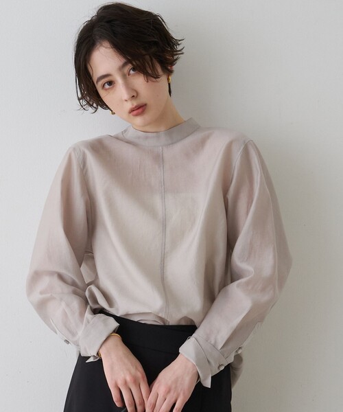 長めタイでアレンジ自在な上品ブラウス 透け感のあるシアー素材を使用したスタンドカラーのタイブラウス。 タイはあえて長めに設計しており、 後ろで結んでバックスタイルを見せたり、 前でリボン結び・一結び・垂らして抜け感を出したりと、 気分やシーンに合わせてアレンジ可能です。 さらに、後ろ肩に入れたタックが適度な立体感を生み出し、 一枚で着たときに美しいフォルムをキープ。 オンオフ問わず使える上品さと遊び心を両立したデザインです。 オフィス:テーパードパンツ+ヒールできちんとした通勤スタイルに。 休日:デニム+ローファーでほどよいフェミニンカジュアル。 夜のお出かけ:黒のタイトスカート+華奢なヒールでエレガントに。 レイヤード:ノースリーブワンピやキャミに重ね、前を開けて羽織り風にも◎ 【注意事項】 ※商品画像は、光の当たり具合やパソコンなどの閲覧環境により、実際の色味と異なって見える場合がございます。あらかじめご了承ください。 ※画像の商品はサンプルです。実際の商品と仕様、加工が若干異なる場合があります。 ※サイズ表記はあくまで目安となります。 ※その他の予約商品、通常商品との同時決済はできません。 ※入荷状況により、お届け予定が前後する場合があります。 ※お客様への発送が店頭販売より遅れる場合もあります。 ※追加生産商品は、一部の店舗、通販で販売中の場合がございます。予めご了承下さい。 ※商品を使用前に、タグ等に記載されている「取り扱い上の注意書き」「洗濯表示」を必ずご確認ください。 ※商品に不良が無い場合、包装紙および箱の彼損がございましても発送いたします。あらかじめご了承ください。