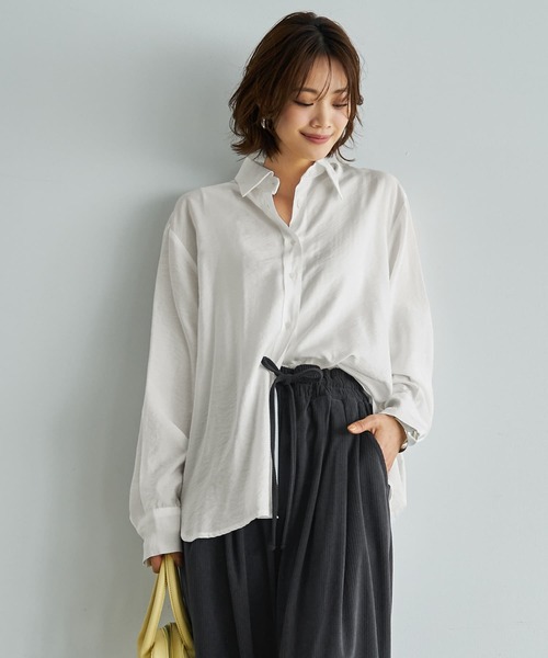 ニットの下にシャツを入れるならコレ 軽やかな生地で春も一枚で素敵な、 アイロン要らずのしなやか白シャツ ◆生地の質感:表面に控えめなシボ加工が入った、オシャレなニュアンスのある生地。薄手寄りで軽く、控えめなシアー感があり、ただ柔らかいというよりは『最低限、必要なハリ感を備えたしなやかな質感』という表現が相応しい柔らかさです。見た目にはわからない程度の微光沢性もあり、肌触りは『ふわっと柔らかなサラサラ感』がある感じです。 ◆サイズ感:ゆったりとしています。落ち感があるためシルエットは大きくならず、何かの下に着てもかさばりません。 ◆シワ:もともと表面にシワのような加工が入っているため気になりません。洗い上がりもノーアイロンで良く、部分的にシワが気になる場合は霧吹きをかけて指で軽くシワを伸ばし、掛けておけばOKです。 【その他の仕様】 ◆着用時期:通年 ◆サイズ感:ゆったりとしたサイズ感 ◆丈感:背面はヒップが隠れる長さ ◆シルエット:ストレート ◆首元:シャツ襟 ◆肩幅:広め ◆アームホール:広め ◆袖幅:広め ◆袖丈:長袖 ◆袖口:カフス+ボタン1個あり ◆着用ジワ:できにくい ◆毛羽立ち:できにくい ◆伸縮性:なし ◆透け感:少しあり ◆スリット:両サイドにあり ◆着脱:フロントボタン開き ◆ボタン:白蝶貝パール風のボタン ◆ポケット:なし ◆手洗い:可能 ◆アイロン:不要 ◆スチーマー:使用OK 【お色について】 ◆ホワイト:一般的な白シャツのお色。イエロー味などの色味感は無いクリアな発色のホワイトです。
