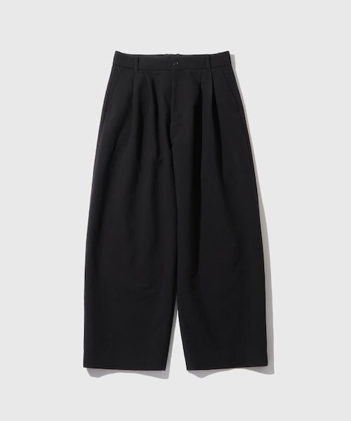 【素材】 ・細番手高密度の二重織のコットンダブルクロス素材 ・特殊樹脂の反発性と心地のいい起毛感を加工にて表現してます ・中肉厚でハリコシがあり、コットンのさらっとした心地よい着用感そのままなのが特徴 ・粗野で男臭く見える生地ですが、糸の番手が細く繊細なのでドレスアイテムとも相性良いです ? 【デザイン】 ・横に広がるワイドバギーシルエットで、太めのラインを楽しめる1本 ・2タックのアウトタック仕様で、腰回りにゆとりを持たせた快適な穿き心地 ・コーディネートに取り入れるだけで、こなれた大人のリラックス感を演出