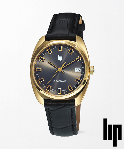 LIP GDG 671878アイコニックな「シャルル・ド・ゴール将軍」モデル。- デザインヴィンテージデザインを現代的に再解釈したこの象徴的なド・ゴール将軍モデルは、ポリッシュ仕上げのゴールドカラーケース(35mm)を採用しています。ガンメタルのサンレイダイヤルは、ブラックの反射が美しく、ブラック×ゴールドの立体インデックスと、3本のゴールド針が際立ちます。スイープ運針の秒針には稲妻型のデザインが施され、初期のエレクトロニックモデルへのオマージュとなっています。3針と日付表示を備え、ミニマルかつピュアなデザインを体現。ブラックのカーフレザーストラップはクロコ調の型押しにトーンオントーンのステッチが施され、ゴールドのアルディロンバックルが洗練された印象を添えています。- 価格改定のお知らせ2026年3月18日より価格改定をさせていただきます。ご了承下さいますようお願い申し上げます。改定後:38,500円(税込み)- ディテール・Ref:671878・タイプ:ユニセックス・ケース素材:ステンレス / GP・ガラス素材:ミネラルガラス・バンド素材:本革 / ブラック・ムーブメント:RONDA 715 / 電池式・平均月差:±15秒・防水性:5気圧 / 日常生活防水・生産国:フランス・保証期間:2年間・付属品:保証書 / ボックス・保証書 / 購入明細について保証書と購入明細は合わせてご保管をお願いいたします。修理ご希望の際は、保証書と購入明細をご提出ください。購入明細はマイページ上から閲覧・印刷していただけます。・モニター電池について時計にセットされている電池は、機能や性能に問題がないかをチェックするモニター電池です。お買い上げいただく時期によって電池残量が変動いたします。新品の電池よりも、稼働時間が短い可能性が考えられます。・時計の時刻についてお届け時の時計の時刻(日付含む)は実際と異なる場合や、リュウズが上がっており動作していない可能性がございます。お手数ではございますがご確認いただき、必要な場合は時刻合わせをお願いいたします。・バンド交換についてHIROB各店舗にて受け付けております。店舗の状況やモデルによりお時間をいただく場合や、弊社工房またはメーカーでのお預かり対応になる場合がございます。・LIP / リップLIPは1867年にフランス東部の街、ブザンソンで創業したフランスを代表するウォッチブランドです。LIPの時計は、フランスを代表する時計ブランドとして自国のドゴール首相、国賓扱いの英国チャーチル首相に贈呈されました。150年以上にわたり、フランス・ブザンソンの工場で一つひとつ組み立てられているコレクションの数々は、決して流行だけに留まらない独自の魅力を備えています。
