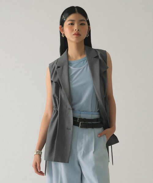 重ねるだけで決まる、レイヤード美■デザイン表面感の美しい薄手のスーチング素材を使用した、クリーンな印象のジレ。ウエストのベルトディテールと、奥行きを生むレイヤードデザインが最大の特徴です。サイドのベルトを引くだけで、着用したまま簡単にギャザーを寄せることが可能。シルエットに変化をつけられるため、その日の気分に合わせた着こなしを楽しめます。■コーディネートシンプルにカットソーやブラウスと合わせるだけで、装いが一気にモダンに引き締まります。スーチング素材ならではの上品さがあり、オンオフ問わず幅広いシーンで活躍。同素材の半袖ジャケット(61-06-0338-462)の上に重ねる、セットアップ風のレイヤードスタイルもおすすめです。■サイズ大きすぎず小さすぎない、収まりの良い絶妙なサイズ設定。■素材きれいめな表情が魅力の、薄手のスーチング生地を採用。さらりとした質感で重たさがなく、軽やかなレイヤードを叶える通年使いしやすい素材です。■ケア方法ドライクリーニングのみ可(詳細は商品についている品質表示ラベルをご覧ください)【GREY】Model:H:175 B78 W59 H89 Size:ONE SIZE【BLACK】BEAMS STAFF:H164 Size:ONE SIZE※光の当たり具合やパソコンなどの閲覧環境によって、実際の色味と異なって見える場合がございます。予めご了承ください。※商品の色味は商品単体で撮影した画像をご参照ください。