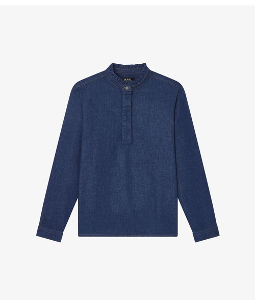 インディゴブルーの薄手デニムブラウス.*ストレートカット.*ラッフル付オフィサーカラー.*衿にA.P.C.刻印入りボタン1つ.*キャラメル色のステッチ.