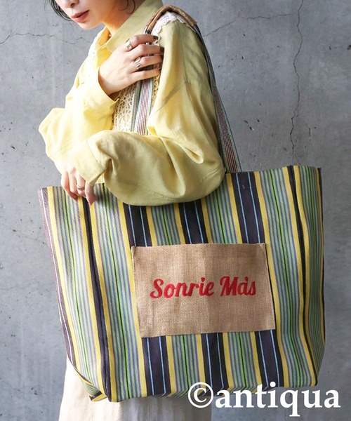 インドの伝統を感じる繊細な風合い、手仕事の刺繍にフォーカスを当てたantiqua発のブランド『mulumulu(ムルムル)』手織りの風合いと表情豊かなストライプ柄が魅力の、大容量トートバッグです。マチのある立体的な形状で、荷物がしっかり入る実用的なデザイン。口元はマグネットボタン付きで、中身が見えにくく安心して持ち歩けます。素材にはリサイクルポリエステルを採用し、使用済みセメント袋を再生したサステナブルな生地で仕立てられています。手織りによるわずかなムラやゆらぎが、ナチュラルな味わいを生み出し、ひとつひとつに個性が宿ります。麻混のしっかりとした生地感と、丈夫な持ち手が日常使いにぴったり。フロントの「Sonríe más(もっと笑って)」の刺繍ロゴがアクセントになり、持つだけでスタイリングの主役に。グリーンミックス(緑・グリーン・Green)とブラックミックス(黒・ブラック・Black)の2色展開。※麻の素材の特性上、肌触りがチクチクと感じられる場合がございます。肌のデリケートな方はご注意くださいませ。※柄の出方は生地の裁断により一点一点異なります。柄の繋ぎ目は全てはあっておりません。ご指定は出来ませんのでご了承の上お買い求めくださいませ。【♡マークを押して、お気に入り登録を!】『ラスト1点通知』、『再入荷通知』、『値下げ通知』など、お得な情報を受け取ることができます!!気になったアイテムは今すぐ ”お気に入り登録” をお忘れなく★★