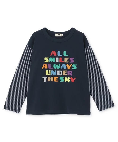 前身頃全体に、カラフルなロゴをクロス刺しゅうで施した長袖Tシャツ。表情のある刺しゅうが魅力的です。袖のボーダー柄も目を引くアクセントに。