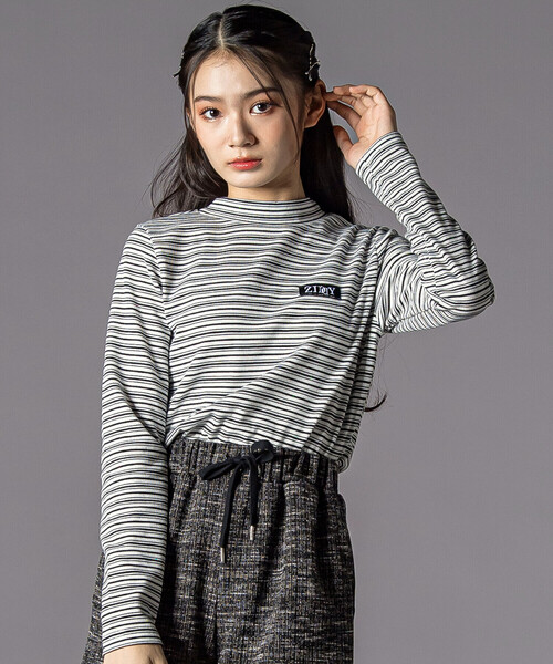 -26SS- モノトーンでキメる、大人見えボーダートップス♡ ■デザイン ホワイト×ブラックのボーダーがさりげなく映えるシンプルデザイン。 ホワイト系とブラック系で印象がちょっと変わるから、色違いでそろえたくなるかわいさ♡ 胸元の織ネームがアクセントになって、シンプルなのにしゃれ見え。 プチハイネックだから、パーカーやカーデのインでもバランスよくまとまる。 “ナチュラル韓国っぽ”スタイルがすぐ完成。 ■素材/機能 ストレッチのきいたポリエステル×ポリウレタン素材で、動きやすくて着心地なめらか。 ほどよい厚みで秋冬の重ね着にも使いやすいアイテム。 やわらかな肌ざわりで通学にもぴったりのデイリートップス。 おしゃれしながらリラックス感も楽しめる、万能ボーダー。 26春夏アイテム 【ZIDDY(ジディー)】 ~teen Lady~ レディーストレンドを取り入れた クールでちょっぴり上品なスタイルを提案。"