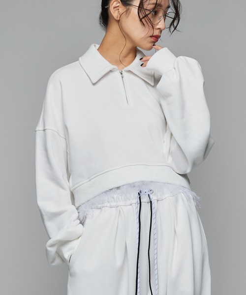 【ポイント】 ハーフジップデザインのスウェットに裾ファーをあしらい、存在感を放つ一枚。 異素材の組み合わせが洗練されたムードを引き立て、コーディネートにモードなアクセントをプラスします。 【デザイン・シルエット】 ウエスト位置で切れる丈感がスタイルアップを叶え、袖丈を長めにすることで袖をくしゅっとさせた女性らしいニュアンスをプラス。 裾のファーはボタンで取り外し可能なので、気分に合わせて印象を変えられる汎用性の高い一枚です。 【おすすめのスタイリング】 ショート丈なのでハイウエストで合わせるとバランスの取れたスタイリングに。 スラックスやスカートを合わせてきれいめに、デニム合わせでカジュアルにも合わせやすく、モノクロカラーを採用していることで柄物やカラー物も相性が良いため、一枚持っておくと着回しが効くアイテムです。 【素材】 コットンの柔らかく自然な肌触りに、ポリエステルをブレンドすることで程よいハリと耐久性を兼ね備えたスウェット素材。 吸湿性と通気性に優れつつ、型崩れやシワになりにくいイージーケア性も魅力。 デイリーに気負わず着られる快適な着心地が楽しめます。