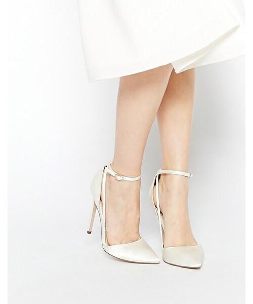 ABOUT ME Lining: 100% Polyurethane, Sole: 100% Resin, Upper: 100% Textile. Smooth satin fabric Pin buckle strap fastening High stiletto heel Pointed toe Wipe clean 100% Textile Upper Heel height: 11.5cm/4"