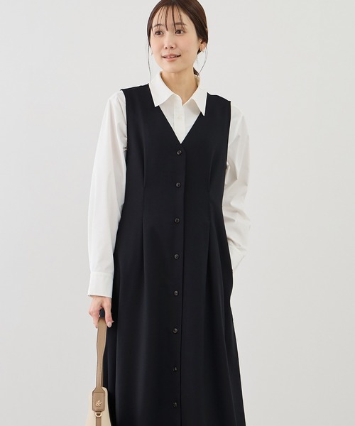 ウエストタックで美シルエットを叶えるジャンパースカート。【素材感】・ポリエステル主体でシワになりにくく、扱いやすい素材感。・薄手のツイード生地で軽やかさと季節感を両立。【デザイン・シルエット】・ウエストタックが立体感を演出し、すっきり見えを実現。・Vネックデザインで顔まわりをすっきり見せ、インナーとのレイヤードも楽しめる仕様。・両サイドには便利なポケット付きで、実用性も◎・ほどよく広がるAラインシルエットが、体のラインを拾わず自然にカバー。・ボタンベルトでウエスト位置を調整し、好みのシルエットに。※ボタン位置は片方で3cm、両方で6cm調整可能。※詳細画像の14~17枚目は内側のボタンで止めています。【カラー】・グレー系(09)、ベージュ系(29)は杢調で奥行きのあるニュアンスカラー。・ネイビー(40)はシンプルな無地で幅広いスタイリングに対応。・落ち着きのある色展開でオンオフ問わず着回し可能。【スタイリングポイント】・シアーロンTやボートネックインナーとのレイヤードがおすすめ。・ジャケットを羽織ったり、インにシャツやブラウスを合わせればきれいめコーデにも対応。・ブーツやパンプスで季節感をプラスし、上品な印象に。【同シリーズアイテム】・ウエストタックジャンパースカート/低身長・小柄さんサイズ(品番:GDE16030)※着丈差4.5cm【前シーズンのウエストタックジャンパースカート(品番:GDE55100)をアップデート】・よりスタイルアップが叶うようにタックの位置を調整。・組成を一部変更しております。旧品番ポリエステル 100%新品番ポリエステル 98% ポリウレタン 2%----------------------------- 裏地:なし 光沢感:なし 透け感:なし 伸縮性:ややあり ウエスト:ゴムなし ファスナー:なし ポケット:あり ボタン:あり(開閉可) 生地の厚さ:普通 その他仕様:ウエストにサイズ調整のボタンあり2段階 季節:春、秋 -----------------------------※撮影時の光、お使いのモニター環境によって色の見え方が違う場合がございます。※2025年秋冬商品より、ワンサイズ展開の商品は「F(フリーサイズ)」表記に変更しております。詳しい採寸はサイズ欄をご覧ください。【モデル着用サイズ】 身長:165cm 着用サイズ:F【2026 Spring】【26SS】