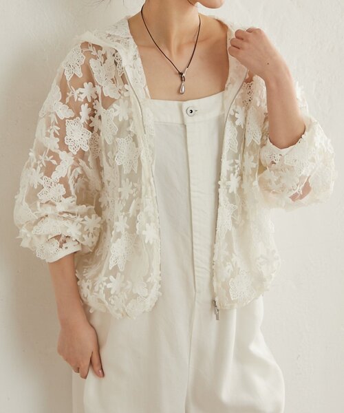 羽織るだけでおしゃれに決まるレースフーディ・シャツ感覚で羽織れる軽い着心地のフーディ・シアーな総レースが華やかで、キャミやタンクトップを合わせるだけでヘルシーな着こなしが叶います。・着用するだけで着映えしてくれるので、シンプルなスタイリングにプラスするだけでコーディネートの主役になるアイテム。・ダブルジップや、裾周りのドローコードなど、細かいディテールにもこだわった一着。・透け感:あり・裏地:なし・伸縮性:なし・生地の厚さ:薄手・光沢:なし・ポケット:なし〈洗濯方法〉手洗い可能--------------------------------------【商品のお気に入り登録】♡をクリックで気になるアイテムをお気に入り登録していただくと、以下の通知を受け取ることができます。・入荷・再入荷・ラスト一点・セール対象時【ブランドのお気に入り登録 】新商品や再入荷、セール、クーポン配布などお得な情報を受け取ることができます。--------------------------------------※画像の商品はサンプルです。実際の商品と仕様、加工が若干異なる場合があります。※カラーにより糸の風合いが異なるため、個体差が生じる場合がございます。※商品の色味は、撮影場所や光の当たり具合などにより色味が異なって見える場合がございます。また、お客様のお使いのPC・スマートフォン等のモニター環境などにより色味が異なって見える場合がございます。予めご了承の上ご注文ください。