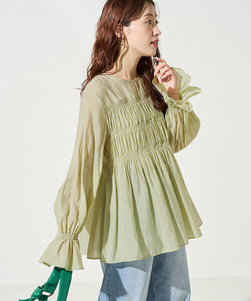 2026 Spring & Summer item クシュっとしたフロントギャザーにきゅん! 春大人可愛く着られるシアーブラウス ●フロントギャザーがアクセントの長袖ブラウス ●袖フリルで表情のあるディティール ●ふんわりしたシルエットで体型カバーも◎ ●上品なほんのり透け感は春にぴったり おすすめコーディネート 春のワードローブに取り入れたいフェミニンブラウスは、デニムでカジュアルに落とすのが正解。 袖をたくし上げてボリュームスリーブを引き立たせるのも抜け感が出て素敵です! あえてスウェットパンツで合わせたラフコーデから、スラックスと合わせた大人カジュアルコーデまで、テイストの幅が広がるのがGOOD! ※こちらの商品は、弊社管理上のカラーを表記しております為、タグのカラー表記と異なる記載となっております。 【サイト表記:タグ表記】 ブルーグリーン:ライトグリーン ブルー:ブルーグレー --------------------------------------------------------- お気に入り登録のオススメ ▼商品のお気に入り登録▼ 再入荷、残り1点、セールなどの通知を受け取ることができます。 ▼ブランドのお気に入り登録▼ 新商品や再入荷、ショップのおすすめトピックスなど、いち早くブランドの情報を受け取ることができます。 --------------------------------------------------------- ※掲載画像の商品の色味は、屋外や屋内の光の照射や角度により実物と色味が異なる場合がございます。また表示のサイズ感と実物は若干異なる場合もございますので、予めご了承ください。 ※寄り画像の色味が実物に近しいです。 ※着用、お取り扱いの際は、商品についている品質表示とアテンションタグを必ずご確認下さい。 ※こちらの商品はオンラインストア及び一部店舗での限定展開となります。 【FREAK'S STORE / フリークスストア】 「アメリカの豊かさとワクワク・ドキドキを日本に伝えたい」という想いからスタート。 1986年の創業以来、洋服を中心に、カルチャーやアートなど自分たちが本当に良いと思うものをセレクト。積極的に楽しむ生活体験者=フリークとして、豊かなライフスタイルの楽しみ方をリアルに提案するセレクトショップ。