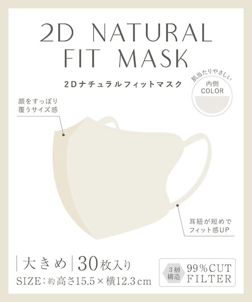 耳紐が短めでフィット感UP&顔をすっぽり覆うサイズ感が魅力の「大きめサイズ」が登場!●鼻が高く、横顔のラインがスッキリきれいにみえるデザインです。●立体形状により口元空間がゆったり広く、リップが付きにくく息がしやすい!●耳が痛くなりにくい平ゴム仕様です。●肌当たりがやさしく汚れが目立たない内側生地。■仕様■3層構造 99%カットフィルターPFE・・・0.0001mm微粒子のろ過効率BFE・・・咳やクシャミ飛沫のろ過効率VFE・・・ウイルス飛沫のろ過効率※マスクは感染(侵入)を完全に防ぐものではありません。※透過性試験測定値(ネルソン研究所)《ご使用方法》1.マスクの上下を確認して、左右に広げます。2.耳ゴム部分を伸ばし、両耳にかけます。3.マスクが隙間なくフィットするよう調整します。《ご使用上の注意》●本品は医療用ではありません。●有害なガスや有害な粉塵が発生する場所での使用や、それらを防ぐ目的には使用できません。●かゆみやかぶれ・発疹等、肌に異常があった場合はすぐに使用を中止し、医師にご相談ください。●使用中に気分が悪くなったり、息苦しくなった場合は、直ちに使用を中止してください。●個人差により、鼻のまわりに隙間が生じ、眼鏡が曇る場合があります。運転の際などには十分にご注意ください。●本商品は使い切りマスクです。洗って再使用しないでください。衛生面から、1日1枚のご使用をおすすめしますが、汚れが気になる場合は新しいマスクにお取替えください。●破損や著しい変形等の不具合がある場合は使用しないでください。●火気のそばで使用しないでください。●本来の目的、用途以外には使用しないでください。●開封後のマスクはそのまま内袋に入れ、高温多湿を避け、お子さまの手の届かない清潔な場所に保管してください。