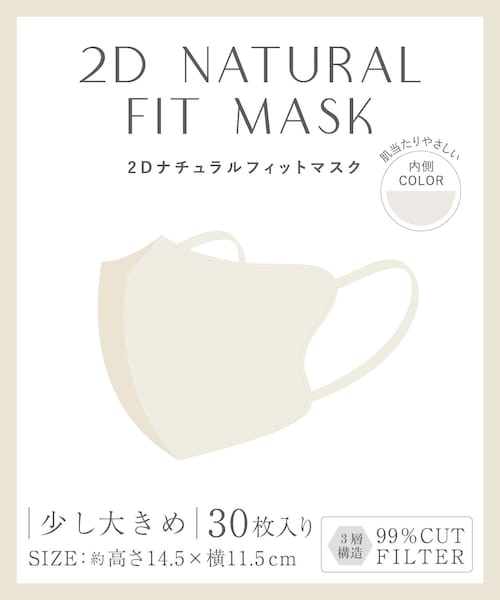 ●鼻が高く、横顔のラインがスッキリきれいにみえるデザインです。●立体形状により口元空間がゆったり広く、リップが付きにくく息がしやすい!●耳が痛くなりにくい平ゴム仕様です。●肌当たりがやさしく汚れが目立たない内側生地。■仕様■3層構造 99%カットフィルターPFE・・・0.0001mm微粒子のろ過効率BFE・・・咳やクシャミ飛沫のろ過効率VFE・・・ウイルス飛沫のろ過効率※マスクは感染(侵入)を完全に防ぐものではありません。※透過性試験測定値(ネルソン研究所)《ご使用方法》1.マスクの上下を確認して、左右に広げます。2.耳ゴム部分を伸ばし、両耳にかけます。3.マスクが隙間なくフィットするよう調整します。《ご使用上の注意》●本品は医療用ではありません。●有害なガスや有害な粉塵が発生する場所での使用や、それらを防ぐ目的には使用できません。●かゆみやかぶれ・発疹等、肌に異常があった場合はすぐに使用を中止し、医師にご相談ください。●使用中に気分が悪くなったり、息苦しくなった場合は、直ちに使用を中止してください。●個人差により、鼻のまわりに隙間が生じ、眼鏡が曇る場合があります。運転の際などには十分にご注意ください。●本商品は使い切りマスクです。洗って再使用しないでください。衛生面から、1日1枚のご使用をおすすめしますが、汚れが気になる場合は新しいマスクにお取替えください。●破損や著しい変形等の不具合がある場合は使用しないでください。●火気のそばで使用しないでください。●本来の目的、用途以外には使用しないでください。●開封後のマスクはそのまま内袋に入れ、高温多湿を避け、お子さまの手の届かない清潔な場所に保管してください。