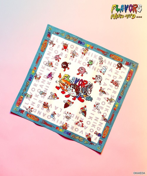 鹿児島発ソフビフィギュアシリーズ「FLAVORS」とニコアンドが初のコラボレーション!FLAVORSの賑やかな世界観をぎゅっと凝縮した、大判サイズのバンダナハンカチが登場!持っているだけで元気がもらえる、コラボならではのキャッチーな仕上がりです。ハンカチとして持ち歩くのはもちろん、お弁当を包むランチクロスや、口の開いたバッグの目隠し、ファッションのアクセントなどにも大活躍!壁に飾ってアートパネル風にしたり、インテリアに使っても可愛いです◎他のコラボアイテムと組み合わせて、気軽なギフト用にもオススメ!【FLAVORS】KAIEDAが手がける、鹿児島発ソフビフィギュアシリーズ「FLAVORS」。大人気で愛くるしくおいしそうなハンバーガー、ドーナツ、ソフトクリームなどのアメリカンテイストのソフビは、世界中にファンが増え続けている。ニコアンドオリジナルデザインのフレーバーズたちが今回だけの特別な描きおろしで登場し、ヴィンテージライクなコレクションに大変身!賑やかでカラフルなniko and ...との特別なシリーズ。<お取扱い上の注意>濃色は色落ちすることがあります。この製品は洗濯で若干縮むことがあります。洗濯後は濡れたまま放置せず、形を整えて干してください。この製品は、直射日光等により変色する事がありますので、お取扱いにはご注意下さい。※サンプルにて撮影をしておりますので、実際の商品とは仕様や加工・サイズ等が若干異なる場合がございます。※屋外の光や照明の当たり具合で、実物と色味が異なって見える場合がございます。詳細画像の色味をご確認ください。 なお、商品の色や質感を出来るだけ忠実に再現するよう心掛けておりますが、パソコンなどの環境により、実物と若干異なる場合がございます。※写真を許可無くコピー・転用することは固くお断りします。