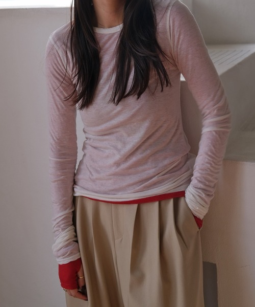 透け感のある素材が軽やかなムードを纏え、スタイリングをブラッシュアップしてくれるロングスリーブTシャツシアー素材が旬な雰囲気を演出する薄手のロングTシャツ。新色とともに再登場です。さりげない透け感と長めの袖丈がヘルシーなニュアンスをプラス。袖口にはサムホールデザインをプラスしアクセントも与えてくれます。2枚重ねて他のカラーを覗かせるレイヤード使いもおすすめ。ノンストレスな着心地で、マルチに使える万能アイテムです。通勤、通学はもちろん、オフィスシーンや普段使いにもおすすめ。---------------------------------透け感:あり裏地:なし伸縮性:あり光沢感:なし生地の厚さ:薄め---------------------------------▼お取り扱い上の注意※お手入れの際は商品の縫込みネーム・アテンションを必ずご確認ください。家庭洗濯〇(40℃限度。手洗いのみ)漂白×タンブル乾燥×日陰での平干しアイロン〇(低温110℃まで。スチームアイロン×)ドライクリーニング〇(弱い処理。石油系溶剤)ウェットクリーニング〇(非常に弱い処理)・染色過程や素材の特性上、特有のにおいが残る場合ございます。気になる場合は陰干しか、お洗濯されることでにおいは減少いたします。・洗濯時、ネットを使用して下さい。・形をととのえてから干して下さい。・色物と白物一緒に洗濯しないで下さい。この商品は、糸及び編組織の性質上、引っかけ・引っかかりやすい性質をもっております。着脱時には下記の点に十分ご注意下さい。・着用時にベルト・バック・アクセサリー・周囲の壁など、表面の粗いものとの摩擦や、引っかかりにご注意下さい。・水洗いや、クリーニングの際にも、他のものとの引っかかりにご注意下さい。・クリーニングの際は、取扱い絵表示をご確認の上お願い致します。この商品は、摩擦(特に湿った状態での摩擦)や、汗や雨などで濡れた時は他の衣料や下着(特に白物)に色移りする場合がありますので、十分ご注意下さい。クリーニングの際は、多少色落ちすることがありますので、出来るだけ単品洗いをおすすめします。また、他の淡色物に色移りすることがありますので、すみやかに処理(脱水・乾燥)するようお願いいたします。以上の点を十分ご留意の上、お取扱い下さい。