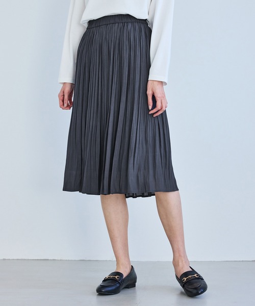 動くたびに揺れる裾が女性らしさを増す。自分好みのサイズを選べる、人気の着丈が選べるシリーズ。MサイズはMTサイズより着丈が16.5cm短い(着丈以外は同じサイズ)。:【素材感】・再生ポリエステルを使用した、サステナブルなアイテム。・ナチュラルなシワ感のある、楊柳素材のロングスカート。・裏地付きで透け感を気にせず着用可能。【デザイン・シルエット】・縦ラインを強調するプリーツデザインで、自然なスタイルアップ効果。・ウエストは総ゴム仕様で、きれい見えしながらもリラックスした穿き心地。・広がりすぎないAラインシルエットで、甘さを抑えた上品な印象。【カラー】・ベージュ、ネイビー、ピンクの3色展開。・肌なじみの良い、やさしく上品なニュアンスカラー。・きれいめからカジュアルまで合わせやすい万能色。【スタイリングポイント】・カーディガンやジャケットを合わせて、きれいめなお出かけスタイルに。・スウェットやニットと合わせたミックスコーデで、程よくカジュアルダウンするのもおすすめ。・足元はバレエシューズやローファーで、女性らしいバランスに仕上げて。----------------------------- 裏地:あり 光沢感:ややあり 透け感:裏地が付いていない部分はあり 伸縮性:なし(裏地はあり) ウエスト:ゴム ファスナー:なし ポケット:なし 生地の厚さ:やや薄手 季節:通年 -----------------------------※撮影時の光、お使いのモニター環境によって色の見え方が違う場合がございます。※屋外で撮影した画像は、光の加減により実際の色味と異なって見える場合がございます。商品カラーは、白背景の画像をご参照ください。※前シーズンのエアリープリーツスカート(品番:GDC15160,GDC14160)と同型。※ヒップの裏地は111cmですが、カットソー素材なので伸縮性があり伸びます。【モデル着用サイズ】身長:165cm 着用サイズ:M、MT【2026 Spring】【26SS】