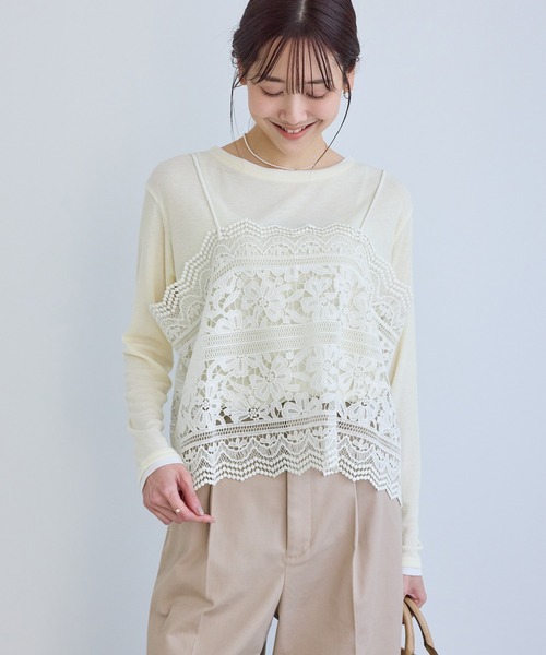 いつものスタイルに重ねたい、ケミカルレースのプラスワン。【素材感】 ・立体感のある表情が魅力のケミカルレースを使用。 ・幾何調の花モチーフで、甘さを抑えつつカジュアルスタイルにも取り入れやすいレース柄。 【デザイン・シルエット】 ・シャツの上からも重ねやすい、ゆとりのあるサイズ感。 ・バックスタイルのアクセントになるリボンディテールは、フィット感の調整も可能。 【カラー】 ・春らしい軽やかなレイヤードに映える、オフホワイトの1色展開。 【スタイリングポイント】 ・レギュラーシャツやベーシックなニット、カットソーに重ねたレイヤードスタイルがおすすめ。 ・ジャケットのインナーレイヤードとしても着回しやすく、スタイリングに奥行きをプラス。 ----------------------------- 裏地:なし 光沢感:なし 透け感:あり 伸縮性:なし 肩紐:ゴム 季節:通年 ----------------------------- ※撮影時の光、お使いのモニター環境によって色の見え方が違う場合がございます。 ※2025年秋冬商品より、ワンサイズ展開の商品は「F(フリーサイズ)」表記に変更しております。 詳しい採寸はサイズ欄をご覧ください。 【モデル着用サイズ】 身長:165cm 着用サイズ:F 【2026 Spring】【26SS】