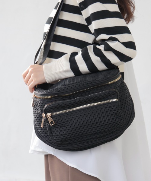 ■POINT「小さいバッグじゃ足りない…」そんな声から選ばれる、頼れるドットメッシュのボディバッグ。見た目はすっきりなのに、長財布・ポーチ・スマホもしっかり入る大容量設計です。中にも外にもポケットがあり、荷物が迷子にならず出し入れもスムーズ。ドットメッシュの軽やかな表情に、ゴールドのファスナーがさりげなく上品さをプラス。カジュアルすぎず、大人のきれいめコーデにも自然になじみます。両手が空くので、旅行やお出かけ、アクティブな日にも活躍する万能バッグです。■FABRIC表地・裏地ともにポリエステル100%。軽くて扱いやすく、毎日気負わず使える素材感。シーズンを問わず活躍します。…………………透け感:なし裏地:なし…………………★商品のお気に入り登録 登録すると、完売しても再入荷時に通知を受け取ることができます。 ほかにもお得な特典があるかもしれません♪ ★ブランドのお気に入り登録 新商品や再入荷などの情報を受け取ることができますので、是非ご登録ください♪