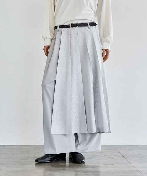 ーーー異なる表情の素材をアシンメトリーに配置した、主役級のデザインワイドパンツ。ーーーDESIGNアシンメトリーデザインを採用し、片側に大きく広がるジャカードパネルをドッキング。まるでスカートをレイヤードしているかのような優雅なフォルムを演出します。繊細なジャカード素材とミニマルな無地生地を組み合わせ、質感の対比を表現。異素材の切り替えが、スタイリングに圧倒的な奥行きと立体感をもたらします。ベースのパンツには落ち感のある素材を使用することで、ボリュームがありながらも広がりすぎず、縦のラインを強調した美しいシルエットを実現。MATERIAL落ち感があり、滑らかな表面感のポリエステル生地で上品な印象。シワになりづらくお手入れも簡単〇細やかな柄を織りで表現したジャカード生地を使用。プリントでは出せない立体感と高級感が特徴です。同素材を使用したシャツも展開。上下で合わせることで、より統一感のある洗練されたモードスタイルが完成します。SET ITEMセットアップ対応アイテムはコチラ→【622493】