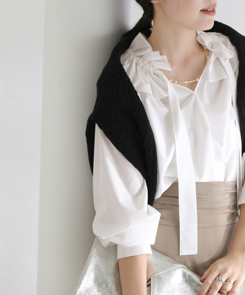 【2026SS】LaTotaliteフリルカラーが顔まわりを華やかに演出してくれるブラウス。首元はリボンを垂らして抜け感を出したり、結んできちんと感をプラスしたりとアレンジ自在。程よくボリュームのある袖とカフス仕様で、1枚でもサマになるデザインです。パンツ合わせでオフィスやきれいめシーンに、デニムと合わせて程よくカジュアルダウンするのもおすすめ。オン・オフ問わず活躍する、着映えブラウスです。**********************透け感:ホワイト(010)のみややあり裏地:なし伸縮性:なし光沢感:なし生地の厚さ:普通**********************【スタッフ着用コメント】《スタッフ名:mizuki》身長:160cm/体型:普通/普段サイズ:S~M/着用サイズ:フリーサイズ感:身頃は程よくゆとりのあるサイジング。着丈は前後差があり後ろはお尻が隠れる着丈。素材感:肌触りは滑らかで程よく張りのある素材。着心地:軽やかで清涼感あり。**********************※取り扱いについては、商品についている品質表示でご確認ください。※照明の関係により、実際よりも色味が違って見える場合があります。またパソコン・スマートフォンなどの環境により、若干製品と画像のカラーが異なる場合もございます。※商品の色味は、商品アップ画像をご参照ください。着用モデル身長:160cm 着用サイズ:フリー本体:手洗い可能