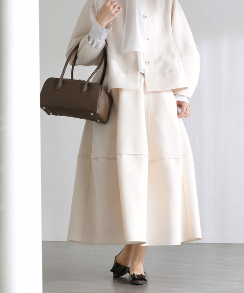 【2026SS】LaTotalite程よいハリと立体感が魅力のボンディング素材を使用したコクーンシルエットのスカート。身体のラインを拾いにくく、自然な丸みのあるフォルムが上品で洗練された印象を演出します。ウエストからヒップにかけてはすっきりと、裾にかけて緩やかに広がるシルエットで、動きやすさと美しさを両立。ボンディング素材ならではのきれいな立体感がシンプルながらも存在感のある一着です。同素材のジャケットと合わせたセットアップスタイルはセレモニーやきちんとしたシーンにもおすすめ◎ブラウスやニット、カットソーなど合わせるトップス次第で、オン・オフ幅広く活躍します。▽同シリーズ26010140903010【洗える】ボンディングショートペプラムジャケット**********************透け感:なし裏地:なし伸縮性:あり光沢感:なし生地の厚さ:普通**********************【スタッフ着用コメント】《スタッフ名:mizuki》身長:160cm/体型:普通/普段サイズ:S~M/着用サイズ:フリーサイズ感:ウエスト周りはややゆとりあり。ウエストはバッグゴム仕様なのでトップスをインすれば程よくフィットしました。素材感:張りと膨らみのある生地で立体的なシルエットをキープします。着心地:ウエストゴム仕様で楽な履き心地。**********************※お取り扱いについて【ネイビー】・単独で洗ってください。・汗が付着した場合は、早めにお手入れしてください。そのまま放置すると色落ちや色移りすることがあります。※取り扱いについては、商品についている品質表示でご確認ください。※照明の関係により、実際よりも色味が違って見える場合があります。またパソコン・スマートフォンなどの環境により、若干製品と画像のカラーが異なる場合もございます。※商品の色味は、商品アップ画像をご参照ください。着用モデル身長:160cm 着用サイズ:フリー本体:手洗い可能