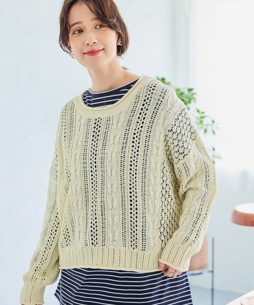 前後2WAYで着用できる襟デザイン春らしい編地がポイントのニットプルオーバーーーー【素材】リネンライクなハリ感のある素材を編み込んだリリヤーン素材を使用。透かし柄とケーブル柄をミックスした軽くて春らしい編地がポイントです。【デザイン】5ゲージで作成された透かしケーブル柄のニットプルオーバー。裾と袖口のリブにも透け感のある編地を使用し、さりげないアクセントに◎前後2WAYで着用できる襟デザインも嬉しいポイントです。トップス ニット シアーーーー【スタイリング】インにシャツを合わせたきちんと感のあるカジュアルコーデがおすすめ。ロンTやシアートップスを合わせても素敵です。
