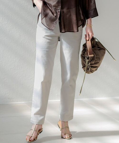 2026 Spring 大人のためのストレッチテーパードデニム ■デザイン ひざから下のラインがすっきりとしたデザインが特徴の、デニムパンツです。少しゆとりをもたせた今っぽいシルエットになっています。カジュアルながらも上品さを兼ね備え、大人の女性にぴったりの一本です。ブラウスやジャケットと合わせてきれいめカジュアルに、Tシャツやニットと合わせてデイリーカジュアルにと、幅広いスタイリングに活躍します。 カラーは、クリーンで爽やかな印象のホワイト(001)、着回し力抜群のスカイブルー(072)、こなれた雰囲気を演出するウォッシュドブルー(074)、シックな印象を与えるネイビー(075)の4色展開です。 ■素材 23区定番のストレッチデニムを使用しており、動きやすくストレスフリーな穿き心地を実現しています。伸びすぎない快適なストレッチ性が魅力です。表面の凹凸感を抑え、クリーンな表情に仕上げています。さらに、通常のデニムよりも色落ちしにくい加工を施しているため、美しい色合いを長くお楽しみいただけます。 ▼同シリーズ 23区DENIM Iライン デニムスカート(品番:SKWOLS0220) ※画像はサンプルを使用している為、実際にお届けする商品と仕様が異なる場合がございます。 ※サンプルはモデルサイズを使用している為、実際の商品のサイズはサイズ詳細の実測をご参照ください。 洗濯表示 【本体のみ】40℃まで弱洗濯可 漂白不可 タンブル乾燥不可 日陰つり干し乾燥 アイロンは160℃まで ドライクリーニング(石油系)可 弱いウェットクリーニング可
