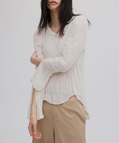 フェミニンな印象のドビー生地にワッシャー加工を施したブラウス。軽やかで上品な印象を与えつつ、日常使いしやすいデザイン。顔周りをすっきりとみせるVネックラインと裾の緩やかなカーブラインがポイント。後ろウエストをゴム仕様にすることで、フィットしながらもストレスフリーな着心地に仕上げました。入卒園式、入学式、卒業式などのセレモニーシーンでのインナーアイテムとしてはもちろん、デイリー使いも可能なおすすめの1着です。---------------------------------透け感:あり裏地:なし伸縮性:あり光沢感:一部あり生地の厚さ:普通お手入れ方法:手洗い可---------------------------------※ブランドロゴのリニューアル移行期間に伴い、モデル着用商品および商品単体画像とお届け予定の商品とで付属品のロゴデザインが異なる場合がございます。予めご了承ください。※商品画像はサンプルのため、色味やサイズ、素材の混率等の仕様に変更がある場合がございますので、予めご了承ください。※モデル着用写真につきましては、光や照明の加減により、実際よりも色味が異なって見える場合がございます。商品の色味は、商品単品の画像をご参考ください。また、使用しているパソコンのモニターやスマートフォン等の設定により、現物と画像の色味が若干異なる場合もございます。予めご了承ください。《 商品に関しまして 》▼ 移染この素材は摩擦(特に湿った状態での摩擦)や汗や雨等で濡れた時はほかの衣料や下着に色が移ることがありますので、着用やお取り扱いの際はご注意下さい。洗濯の際、ほかの物と一緒に洗わないで下さい。濡れた状態でほかの洗濯物と一緒に重ね合せないで下さい。漂白剤及び漂白剤入りの洗剤のご使用は避けて下さい。素材の合わせによっては、着用時の摩擦によってアウターやバッグ、靴等に色移りする可能性があります。コーディネートには十分注意してください。▼ ピリングピリングとは繊維の表面が着用中に擦られたり、もまれたりする為、毛羽の小さなもつれが絡み合い、次第に大きくなってできた毛玉のことです。これは、素材の特性上着用の際避けられない現象で、その発生を完全に防止することはできません。ピリングにはお手入れが肝心です。気に入っているからといって、毎日同じ製品をお手入れなしで着続けますと、必ずピリングはできやすくなります。1日着用したら2日休ませる等ローテーションを考えて着用して下さい。ピリングができましたら引っ張って取ろうとせず、ブラッシングするか、小さなハサミで一つ一つ取り除いて下さい。